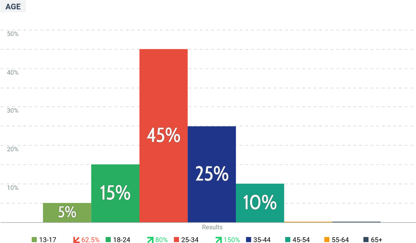 Based on the data, the conversation around Lady Gaga and mental health is most prominant by those ages 25-34 with 45%, then 25% for 35-44 year olds and 15% for 18-24 year olds.