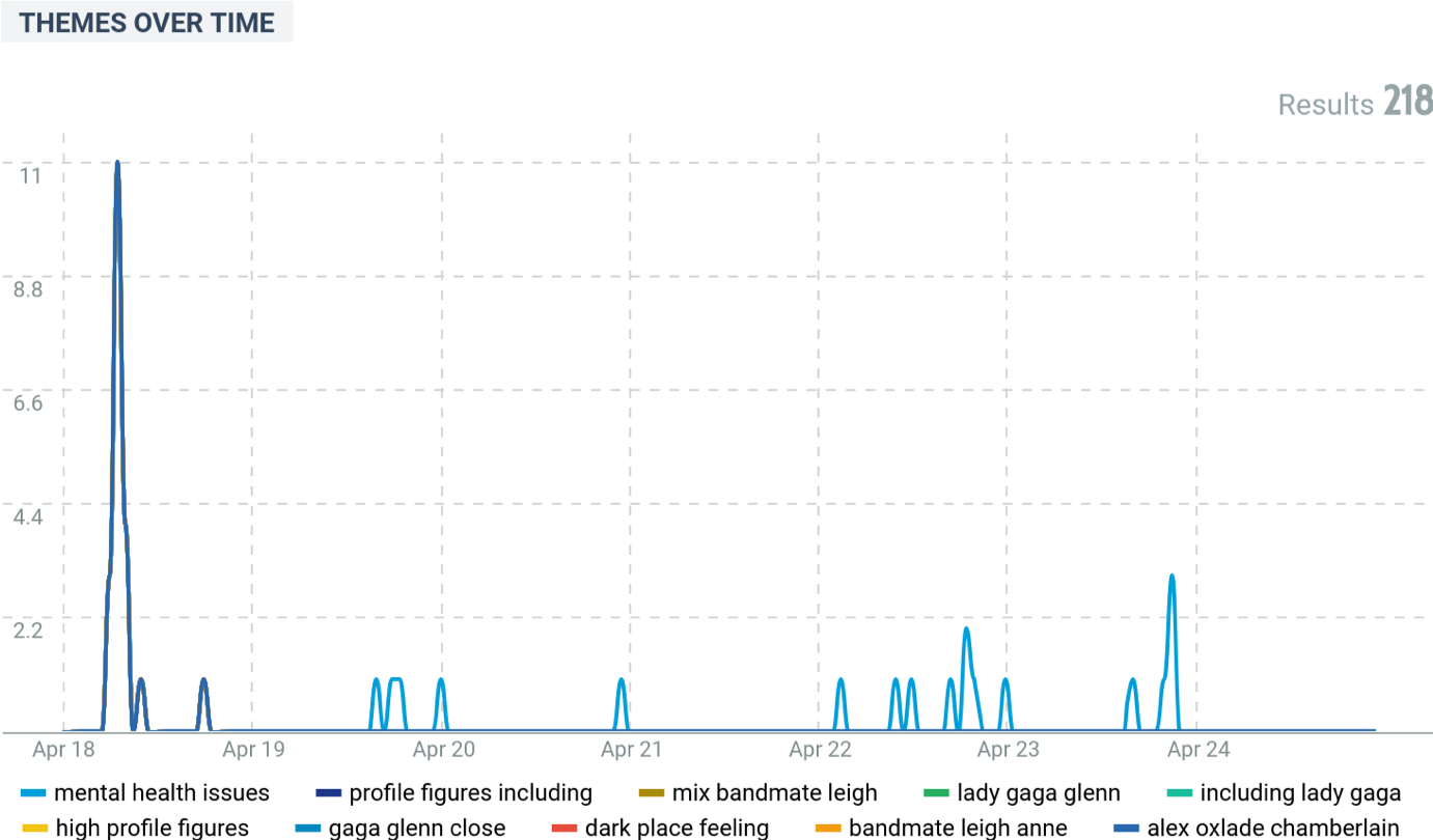 The top themes that are associated with Lady Gaga and Mental Health keywords over this past week include "mental health issues" and "profile figures including." Upon looking into it, singer Perrie Edwards had an article about her own experience with mental illness and panic attacks that went viral. It mentioned high profile figures who are bringing mental health to the forefront like Lady Gaga, Glenn Close and Prince Harry.