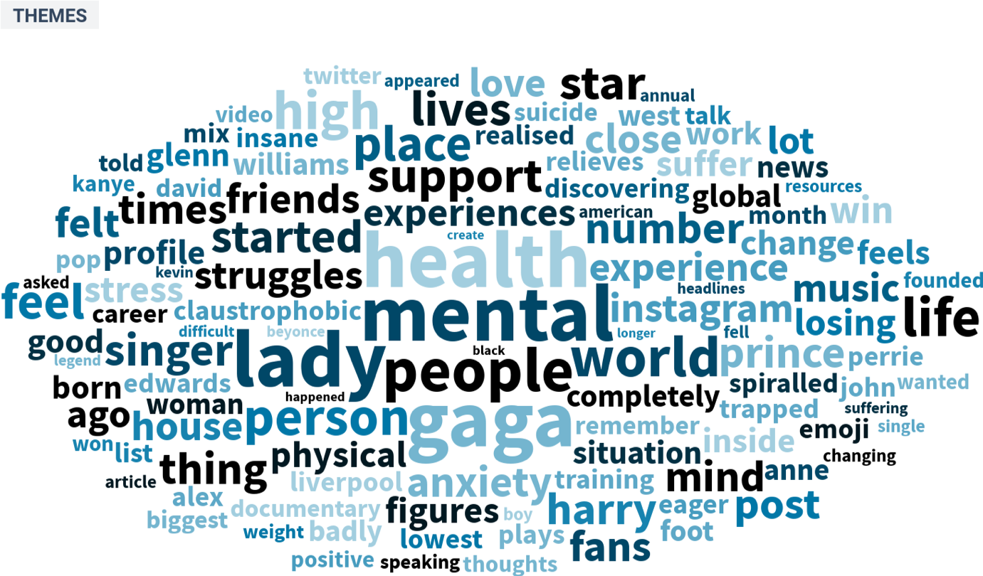In understanding the themes that are associated with content that is posted about Lady GaGa and Mental Illness, we can get a better look into key trends or themes that are taking place online. Based off this, to no surprise the keywords and themes are "health," "mental," "people," "support," and more.