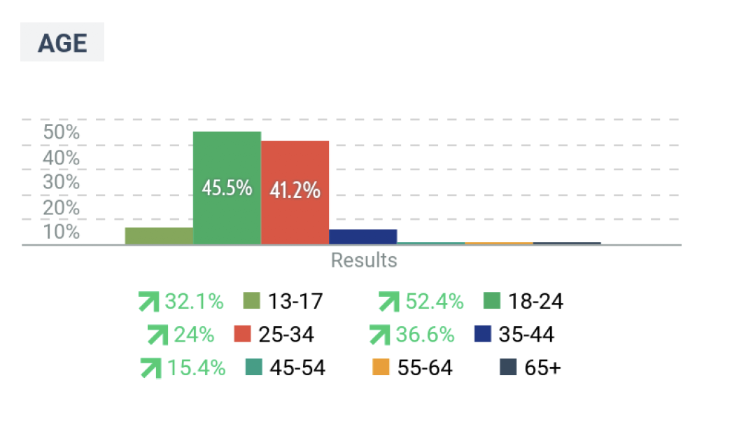 Based on the data, To Write Love on Her Arms is resulting in the most conversation by those ages 18-24 with 45.5% with 25-34 year olds just slightly behind with 41.2% of the conversation.