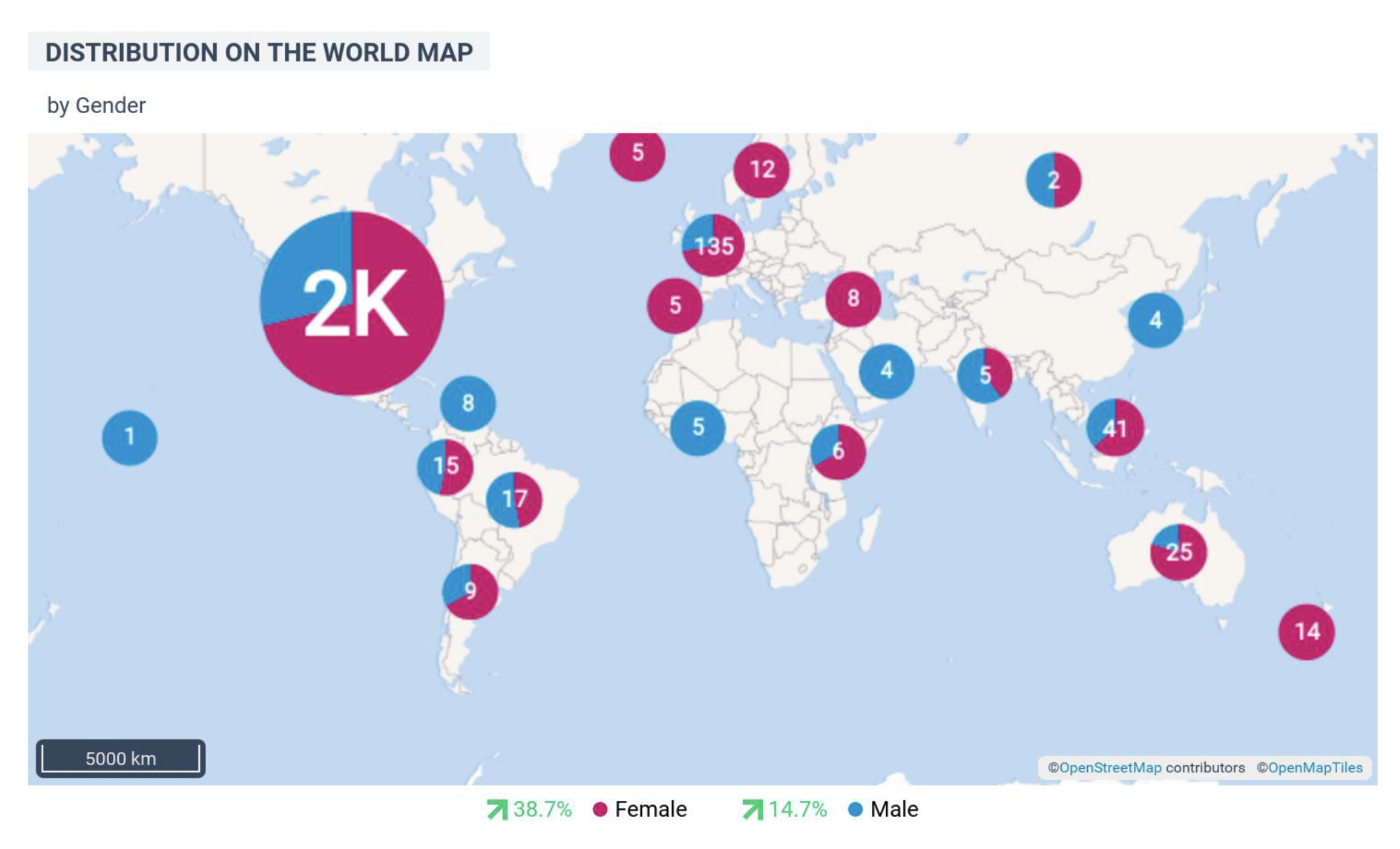 The Gender Distribution map indicates how many people have posted about To Write Love on Her Arms on their personal posts based on their gender and where they posted it. It's no surprise that the conversation around the brand is performing the strongest in the United States since they are based out of the U.S.