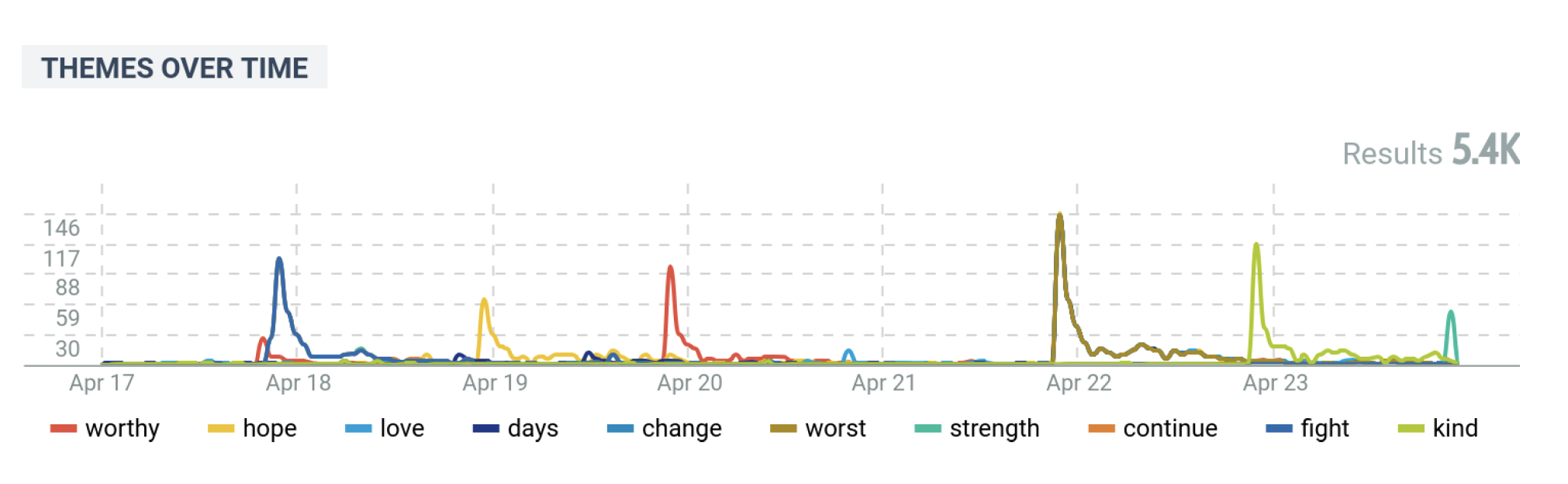 The top themes that are associated with To Write Love on Her Arms over this past week include the words "worthy," "kind," and "hope." The word "worst" is also dominating the conversation, which may initially seem negative in sentiment. However, upon looking at the breakdown in tweets the keyword worst is directly taken from a quote TWLOHA recently posted that receieved a lot of reposting, " You are worthy of love, of hope, and of help. Not even your worst days can change that."
