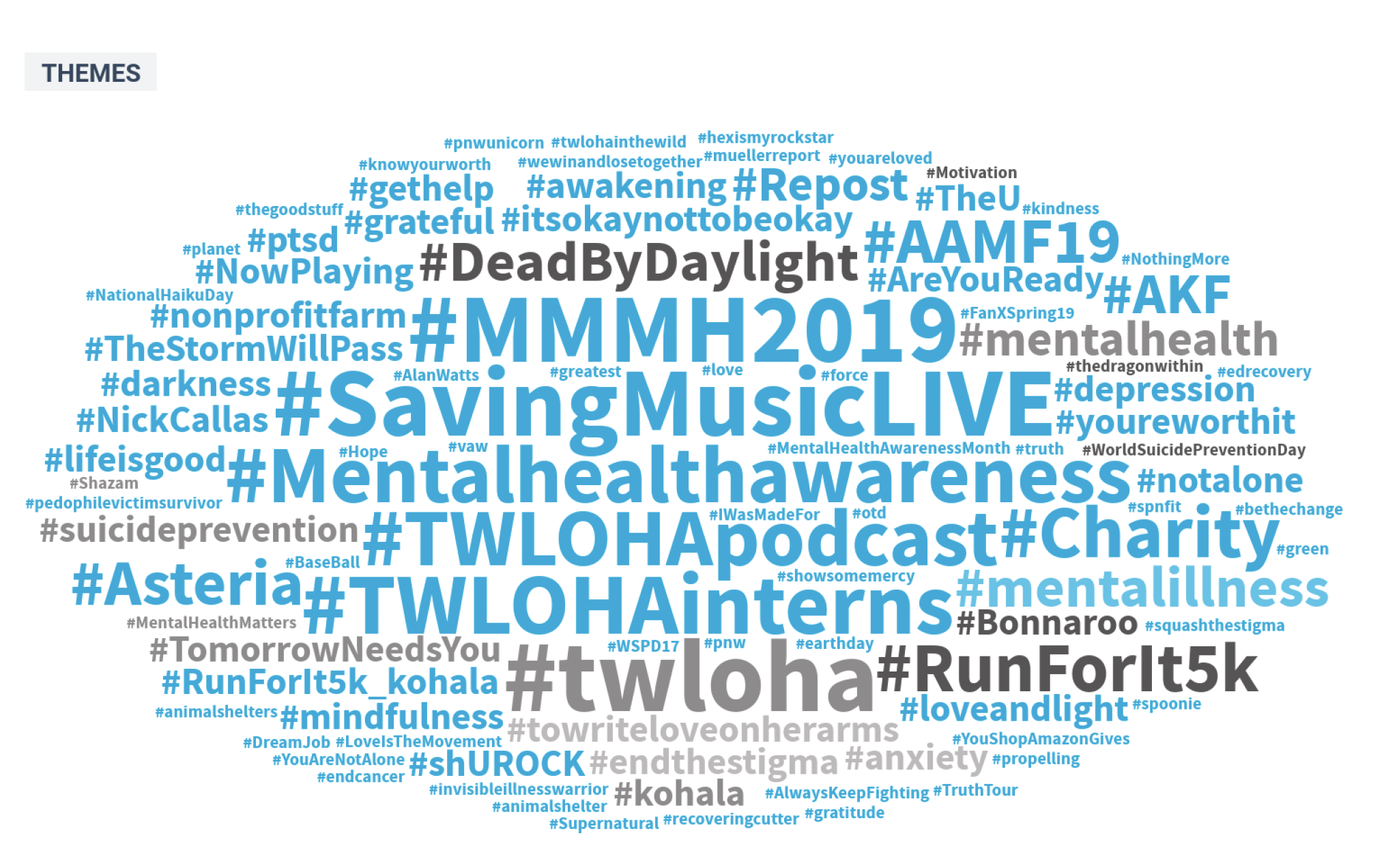 In understanding the themes that are associated with content that is posted about To Write Love on Her Arms, we can get a better look into key trends or themes that are taking place online. This gives insight into what content To Write Love on Her Arms could potentially write about that would connect with their audience. Two of the top hashtags include #SavingMusicLIVE and #MMMH2019 which stands for May Music Mental Health 2019. They campaign created by Saving Music Live, a group of musicians who team up on Twitch to keep music alive in schools and hearts of people world wide, are raising funds for To Write Love on Her Arms.